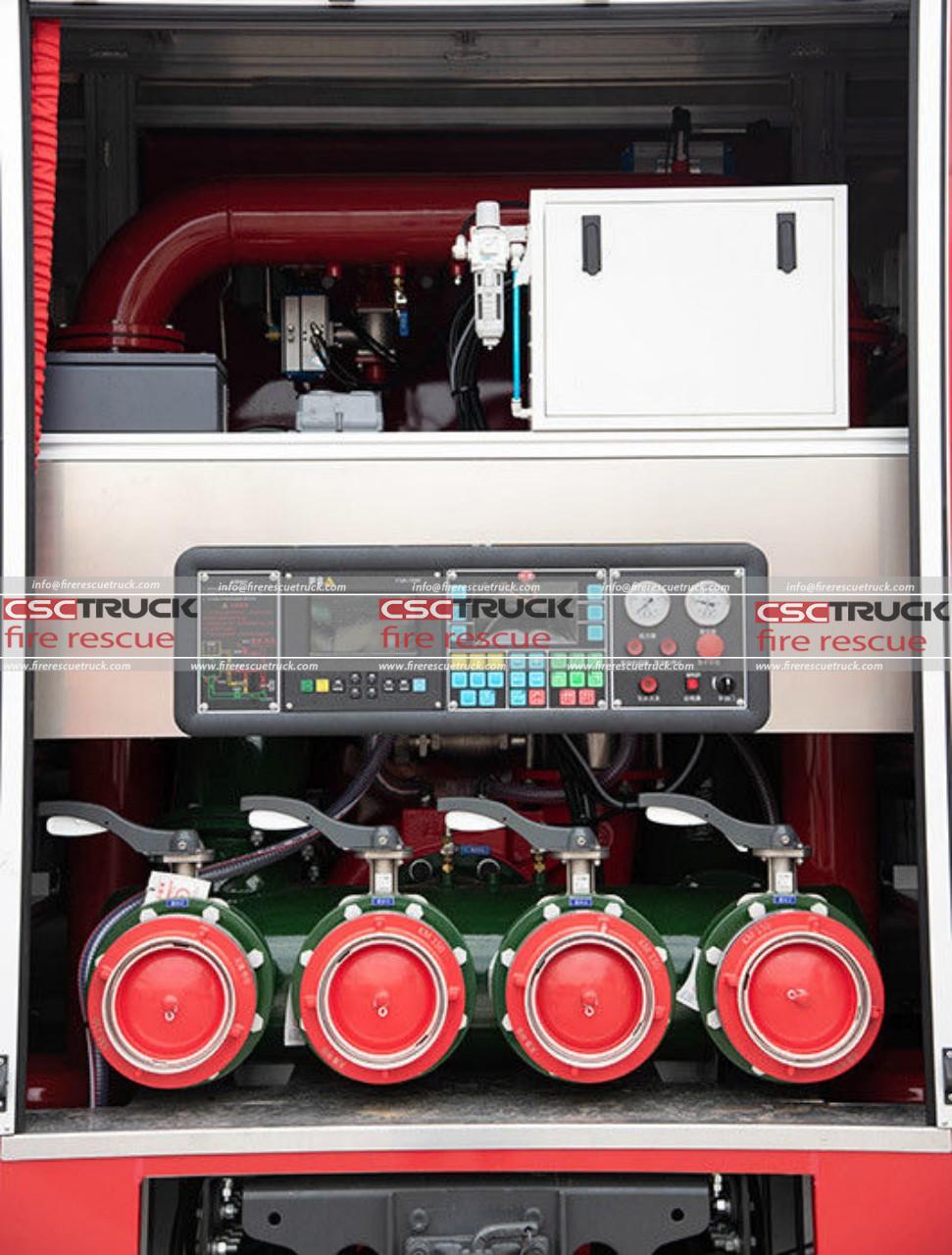 This vehicle is fitted with a high-capacity water pump capable of delivering 10,000 L/min at 1.03 Mpa, alongside a fire monitor with a flow rate of 9,000 L/min at 1.0 Mpa. With a suction height of 7 meters, the truck can efficiently draw water from natural or man-made sources. Its advanced fire monitor provides water shooting distances of ≥90 meters and foam distances of ≥85 meters, with remote control operation and 360° horizontal rotation (0°–355°) for precise targeting, making it highly effective in controlling large-scale fires.