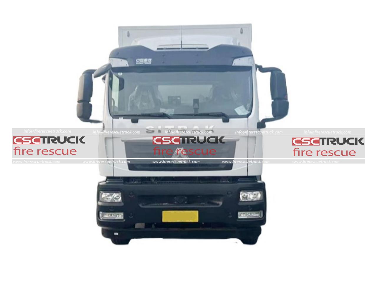 The SITRAK 10 wheelers modular medical unit is constructed using fiberglass reinforced plastic (FRP) outer panels combined with XPS sandwich insulation, providing excellent thermal insulation, durability, and hygiene. A fully equipped hydraulic system with automatic leveling and a high-capacity tail lift (2,000 kg load capacity) enhances operational efficiency, allowing safe loading and unloading of medical equipment.